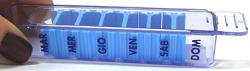 Mini 4U® PORTAPILLOLE SETTIMANALE Caratteristiche Astuccio settimanale tascabile, suddiviso in comparti regolabili con l'indicazione di tutti i giorni della settimana. Contiene le pillole che devono essere somministrate durante l'arco della settimana facilitandone la suddivisione. Il nome e il dosaggio del farmaco possono essere riportati sul fondo del portapillole. È possibile inserire anche più pillole nello stesso vano spostando e regolando a piacimento le pareti interne del dispenser. Apertura e chiusura con coperchio scorrevole e chiusura a scatto. Dimensioni: cm 9,5 x 2 x 1,7.